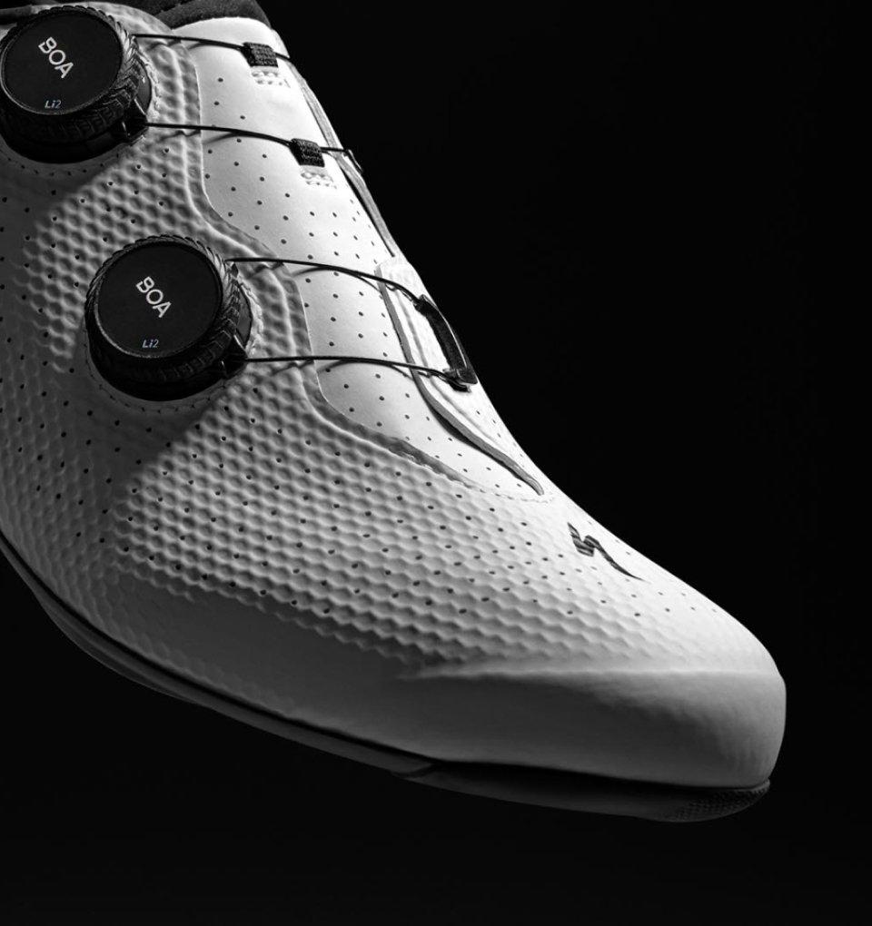 De torch 3.0, geen compleet nieuwe schoen maar wel een vernieuwde versie. Nog dichter aanleunend bij de s-works torch dan ervoor. De unidirectionele carbon zool, die we al eerder zagen bij het S-works model, zal de poweroverbrenging nog efficiënter doen verlopen. Gecombineerd met de dubbele boa Li2 sluiting, rekenen we af met de zogenaamde 'hotspots'. Plaatsen op de voet die afgekneld worden bij het aanspannen van de schoen. Door het gebruik van de geperforeerde stof, is de schoen lichter maar vooral nog meer luchtdoorlatend dan zijn voorganger. Kortom, een S-works kwaliteit schoen, met de specialized branding erop.